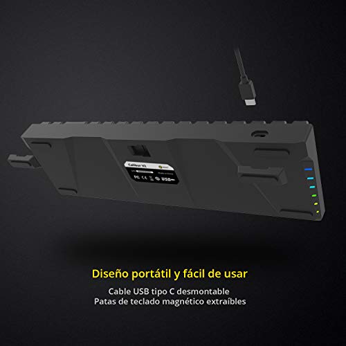 Calibur V2 se ha mejorado en base a Calibur, el cual es más corto y compacto, y cuenta con una verdadera retroiluminación RGB tanto frontal como lateral. Compatible tanto con PC como con Mac, se cambia fácilmente pulsando FN+TAB. Cable USB tipo C desmontable, dos pares de patas magnéticas para ajustar la altura del teclado, las teclas marcadas con láser ABS combinan una gran sensación y una mejor transparencia para la retroiluminación. Macros y control de medios, retroiluminación RGB y atajos de teclado personalizables con el potente software DPC.